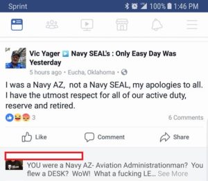 He was drunk, that’s why he pretended to be a SEAL. He got drunk, went to the military surplus store, bought the pin on Trident, bought the cloth Trident and took it to the little sewing shop, waited for them to sew it on and the drove home, still drunk, took pictures, uploaded the pics to Facebook, and then claimed that he was a SEAL.