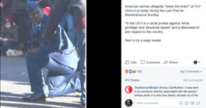 Soon after the event, a photo of the airman taking a knee was shared on the Facebook Traditional British Group. The site also includes multiple posts attacking immigration, left-wing politics, the media and the influence of minority groups.