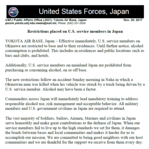 Buying and drinking alcohol was banned for U.S. military personnel all over Japan. As well, those on Okinawa were restricted to base and their residences, until further notice.