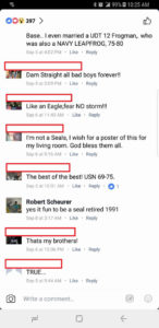 Maybe you could give the readers a tip sheet on what to ask someone claiming to be a SEAL. I ask the number of their BUDS class and MOS.i also assume they are lying from the start. After our conversation I send their name to Veriseal.