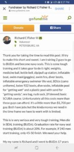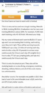 Our partners at Military Phonies send us their work on this fellow, Richard Copeland Fisher III who offered his experience as a failed Navy SEAL to a couple of kids to help them prepare to graduate from BUD/S, even though he hadn’t completed the course. He tried to raise money for equipment through GoFundMe and he had a pretty rigorous plan for them;