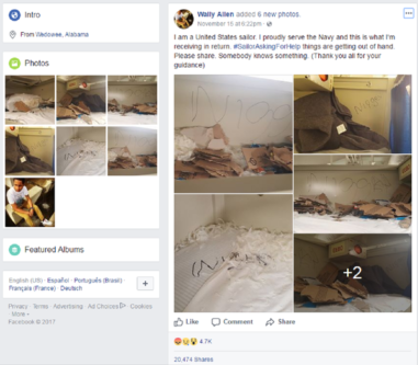 Marquie Little, 27, an African-American crew member aboard the USS George H.W. Bush aircraft carrier, used a pseudonym to post photos of the slur Nov. 15, the Navy Times reported. As of Friday, the Facebook post had garnered 20,500 shares.