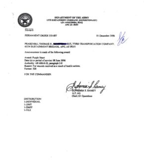 The article says that Prasenski was evacuated for the time he was injured in an IED incident, and that may be true, but his injuries didn’t merit a Purple Heart, looking at his records. So I guess he decided to award one to himself.