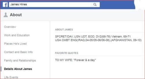 Our partners at Military Phonies share their work on James Hines who claims that he trained in UDT and served in combat in Vietnam, Afghanistan and Iraq.
