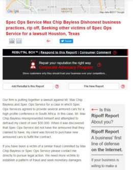 Someone sent us their work on this fellow, Max William “Chip” Bayles. He’s been busy making a reputation for himself for being an expert in the area of personal security and contract paramilitary issues. He hasn’t been very successful in that regard. A number of complaints have been issued in RipOff Report;