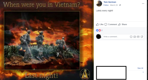 Our partners at Military Phonies share with us their work on this Thomas Norman fellow. Apparently, he tried to join some stolen valor communities, hiding in plain sight, as it were, pretending to be a SEAL that served in Vietnam and suffers in silence. That backfired;
