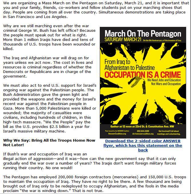 So, why, in the Age of Obama are they planning on marching? ANSWER’s website says;
