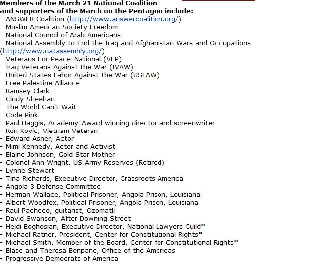 ANSWER and their attendant allies are planning their annual (well, except last year) March on the Pentagon trying to recreate their hey-day of the sixties. The list of participant organization reads like the index of Discover the Networks;