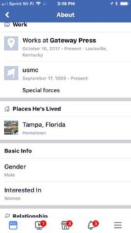 His FB profile is open for people to see. Got a chuckle out of the meme pic he has that says “I may not have a PHD but I have a DD214 and the title U.S. Marine.”