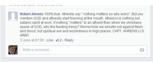 Someone sent us their work on Robert Frank Ahrens of Stokesdale, North Carolina, who claims that he’s an Army Captain to reinforce his political opinions on Facebook.
