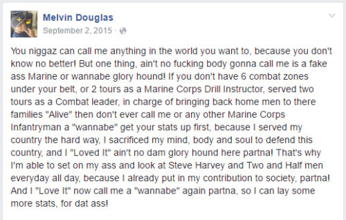 I found it interesting that Melvin Douglas seems more concerned with the title of Drill Instructor attached to his name than with the responsibility that it brings. He should be more concerned with setting an example for all of the Marines that he trained, and these hate-filled rants would be disappointing for some of them to read.
