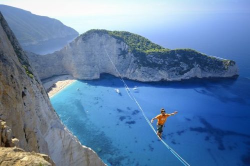 A slackliner walks a highline over Navagio Beach in Zakythos, Greece. Slacklining is a sport involving a flat rope strung between two points, often with less tension than a tightrope. Those who walk across wear harnesses connected to the slackline, to catch them in the event of a fall.