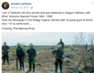 Our partners at Stolen Valour – Canada share their work on this Arnold LePotvin (with two FB pages) fellow who claims that he served in Vietnam 1963 – 1965 with the Special Forces – Recon Division and the 82d Airborne Division where he made eighteen combat parachute jumps on “search and kill” missions. The 82d was in Vietnam 1967 – 1968 and they made no parachute jumps while they were there. The only combat parachute jump in Vietnam was made by the 173rd Airborne Brigade in Operation Junction City in 1967.