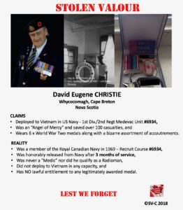 Our Partners at Stolen Valour – Canada share with us their research on this fellow, David Eugene Christie, yet another Canadian who falsely claims service alongside US troops in Vietnam.