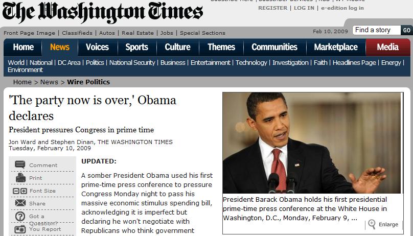 Mr. Obama pronounced “in fact, the party now is over” for free-spending Americans, defended his cataclysmic language on the health of the economy and said bipartisanship will have to take a back seat to getting an economic recovery spending bill completed.