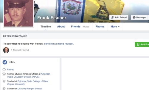 Someone sent us their work on this fellow, Frank Fischer in Martinsburg, West Virginia who did an interview with the local Journal-News during which he claims to be an Army Ranger and a sniper and a paratrooper and Air Assault trained;