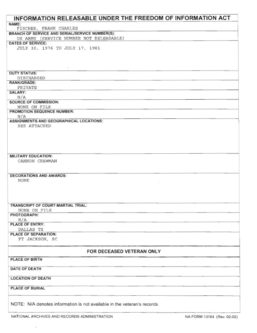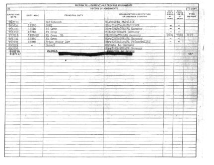 His cap says that he was a staff sergeant (E-6) and the FOIA says that he left the Army as a private. According to his assignments, he never reached an NCO duty position during his four years of service. No Airborne School, no Air Assault training, no sniper school, no combat deployments to Grenada or Just Cause.