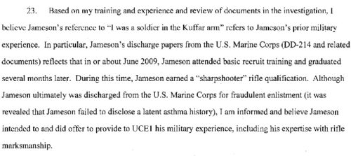 Last month, we talked about Everitt Aaron Jameson, a youngster who decided to become a jihadist and commit a act of terrorism but the FBI interceded in his plans. In their investigation, the FBI discovered that he had been in the Marine Corps, but that he had been discharged because he had lied about his medical history (specifically, his long history of asthma) when he enlisted.