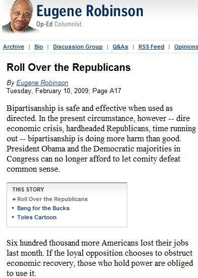 For the last 15 years, all we’ve heard is the Democrats demanding that every bit of legislation be “bi-partisan” – that the Republican majority allow Democrats to craft bills and policy. Of course, instead of being “bi-partisan” the Democrats instead just voted ‘no’ on everything. Now it’s their turn to be ‘bi-partisan’ and it just ain’t hap’nin’. So the hyperpartisan Eugene Robinson at the Washington Post (sorry, I’m not linking to the boob’s column) says suddenly “That’s OK.”