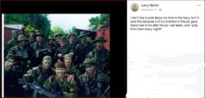 Our partners at Military Phonies share their work on this fellow, Larry Martin. He claims to have been a Navy SEAL, but he wasn’t brave enough to keep his Facebook page up after he was confronted;