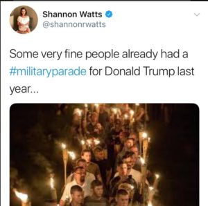 Shannon Watts, the founder of Moms Demand Action For Gun Sense in America doesn’t like Donald Trump. She was counting on a Hillary Clinton presidency to get rid of those evil guns that protect law abiding Americans from criminals, so she takes a swipe at Trump on Twitter by comparing the troops to the White Nationalists with Tiki torches at the Unite the Right rally in Charlottesville last year;