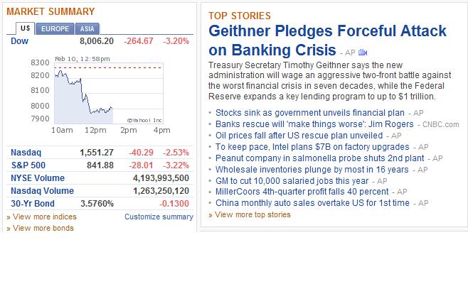 U.S. Treasury Secretary Timothy Geithner rolls out the renamed “Financial Stability Plan” and the Dow Jones drops almost 400 points to close under 8000?