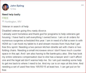 What a wuss – crying ’cause his wife took everything (meaning the only box of mac & cheese left in the house) and wanting others to give him free stuff.