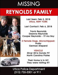 Reynolds, 25; his wife, Deanna; and their 19-month-old son, Cooper, were last seen by Deanna Reynolds’ family on Feb. 5 in Utica, WTVD reported.