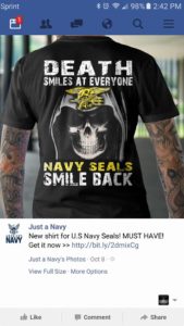 Actually, that gives me an idea! Someone should start an over the top Navy Seal clothing line, with huge Tridents, scary sayings, and macho phrases like this – stuff that no respectable Seal would EVER wear. When someone actually buys something, their contact info automatically goes over TAH, MP and The Don. We’d have a never ending source of idiots for very little effort.