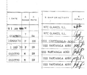 According to his records, he served in the Navy for about 21 months January 1969 – 1970 with seven months aboard USS Nantahala, a Cimarron-class replenishment oiler which sailed the Atlantic and the Mediterranean during those months. He left the Navy as an E-3.