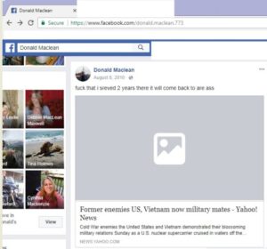 “Hello Post 360. Are you aware that Donald Maclean has been found to be embellishing his military service. While he was stationed aboard a Replenishment oiler, cruising in the Atlantic and the Med, he claims that he was in the “Brown Water Navy”, in Vietnam. He wears a Vietnam Service ribbon patch on his motorcycle vest, and his records do not reflect that service. We at the blog linked below, believe that he has chosen to stand in the blood of better men than he to claim the valor that they fought, were wounded and died for. You can read about him and his claims and his correct service record at the link. We have found that if a veteran will lie and embellish his service, he will lie about other things.