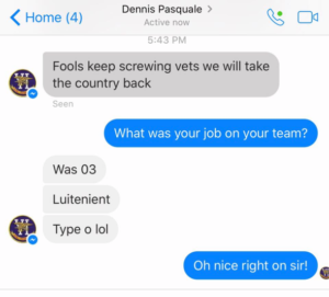 Our partners at Military Phonies send us their work on this Dennis Pasquale fellow. I thought about just posting the above picture and leaving it at that. I mean, how much more proof do you need than that picture? But that wouldn’t be fair, I suppose. Besides, there are tattoos and motorcycle club vests involved. And illiteracy;