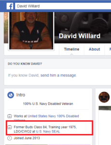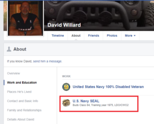Our partners at Military Phonies send us their work on this fellow, David Willard. He claims to be a Navy SEAL, and he’s convinced a lot of his friends that he’s a SEAL. Willard even has a jeep with the Trident painted on the hood and a fugly cap that only pretenders buy;
