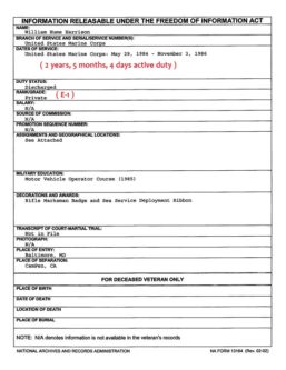 Pvt Harrison was discharged from Marine Corps on Nov. 3, 1986 as a Pvt. E-1.