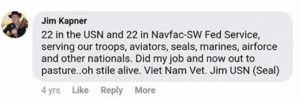 Mr Kapner retired from the active duty Navy and Reserves after 22 years as an AE1 – an Aviation Electronics Mate 1st Class, an E-6. But no awards for Vietnam service, no Combat Action Ribbon, no Purple Heart, no SEAL training.