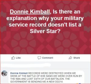 8. BTW, the actual records indicate that Kimball was in two different provinces during the Battle of Khe Sahn and Khe Sahn is located in neither one. So, the lost or destroyed records must have been replicated, eliminating a Silver Star, a Purple Heart, and placing Kimball where he wasn’t. Sure, that’s all credible.