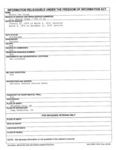 In general, you don’t get a DD214. What the NPRC clerk appears to do is go through the file and summarize the service on a National Archives form (NA form 13164). On those occasions when you do get a DD214, it’s heavily redacted – much of the info on a DD214 is not releasable without the individual’s consent. Two of those non-releasable items are nature of discharge (e.g., entry-level, honorable, general/hon, general/OTH, bad conduct, or dishonorable) and the reason for discharge. Yeah, I’m kinda scratching my head over why the type of discharge is non-releasable too.