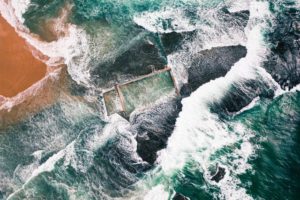 Waves crash on a public beach in Sydney, Australia. The stone structure is an ocean pool, designed to let swimmers do laps while still enjoying the natural water.