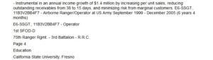 According to Linkedin, he graduated from Fresno State with a business degree right after his cup of coffee with the Army. It seem like plenty of phonies are also earning college degrees in the same time frame of their supposed service. Although the background of his Linkedin profile has a uniform sleeve bearing SF, Ranger, and Airborne, he does not list any Army experience. I guess that he wants you to think he supports the Army’s elite warriors with out claiming to be one? Doubtful…I bet he boars ’em around the water cooler with all his “ops stories”