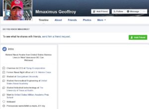 Someone sent us their work on this fellow, Geoffroy Maximus, who claims that he’s a retired Marine Corps aviator living in Vancouver, BC, Canada;