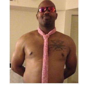 No bandana, but the pink necktie over his shirtless torso and discount Highway Patrol shades are a formidable pairing.
