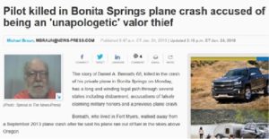 One such example is Daniel A. Bernath, in photo below, who I and others investigated for over four years. Bernath was one of the worst Valor Thieves we have ever encountered. Due to our work, Bernath was being investigated by federal, state and local authorities in several jurisdictions for distribution of child pornography and other unsolved heinous crimes. Like all Valor Thieves, Bernath was a coward, he crashed his airplane straight in to the ground on January 22, 2018 as we closed in on him. In addition to being a confirmed Valor Thief, it should be noted Bernath was a really bad lawyer and poorer pilot.