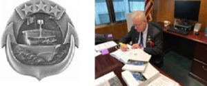 Small Craft Qualification – False claim, there is no official record of qualification and or designation. Created in the mid 1970’s after the Viet Nam War, the Small Craft Insignia is awarded to only very skilled and qualified officers and petty officers commanding small combatant vessels that patrol brown-water (littoral zone) and riverine environments. Voepel is not authorized to wear, has never been retroactively awarded the Small Craft Insignia and was never assigned to any small boat and or craft unit, although Voepel has been photographed and regularly wears the Small Craft Insignia. Voepel commanded no boat or craft, yet he sits at his desk, in photo below, wearing the Small Craft Insignia.