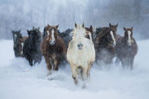 Horses run through the snow in Hokkaido, Japan. While perhaps not typically associated with Japan, horses have lived in the country for almost 2,000 years. In fact, there are eight purebred Japanese breeds.