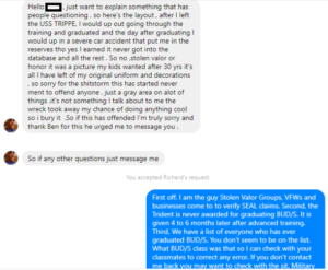 Our partners at Military Phonies share their work on the fellow, Richard Pence, who claims that he went through BUD/S training, but he got in an accident the next day, so he never went to the teams;