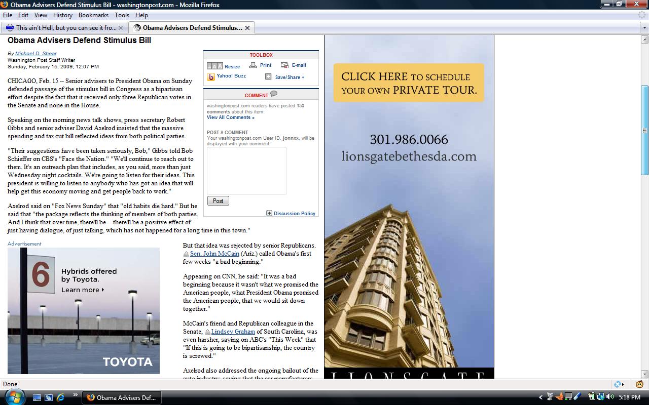 I guess what surprises me is the sudden combativeness evident in Lindsey Graham. Between telling Maxine Waters that the “stimulus” bill was enough to make most Americans throw up, to the comments in the above article about how the nation is “screwed” if this is Obama’s idea of bi-partisanship, I have to say, I like the new Lindsey, but I’m willing to bet he won’t be around long…I’m sure his sissy-ass twin will be along any moment now, ready to bend at the waist and take one for bi-partisanship.