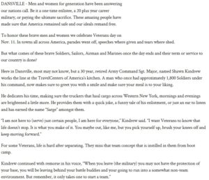 Here in Dansville, most may not know, but a 30 year, retired Army Command Sgt. Major, named Shawn Kindrew works the line at the TravelCenters of America’s kitchen. A man who once had approximately 1,800 Soldiers under his command, now makes sure to greet you with a smile and make sure your meal is to your liking.
