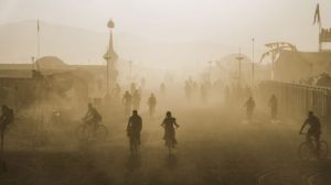 At Black Rock City—the temporary city raised in the Nevadan desert for the annual Burning Man festival—camps are laid out as if on a clock. On a street in the 7:30 camp sector, festival-goers bike through the omnipresent dust as the sun sets.