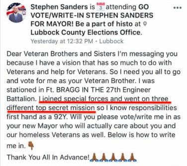 Our Partners at Guardians of the Green Beret share their work on this fellow Stephen Sanders who claims in his campaign for mayor of Lubbock, Texas to have been a special forces trained supply guy;