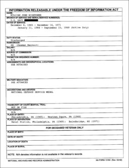 Lets see 4 years in the Navy, left as an E-1 and no Good Conduct medal. The brothers insight into him going over the hill seems to provide the missing link.